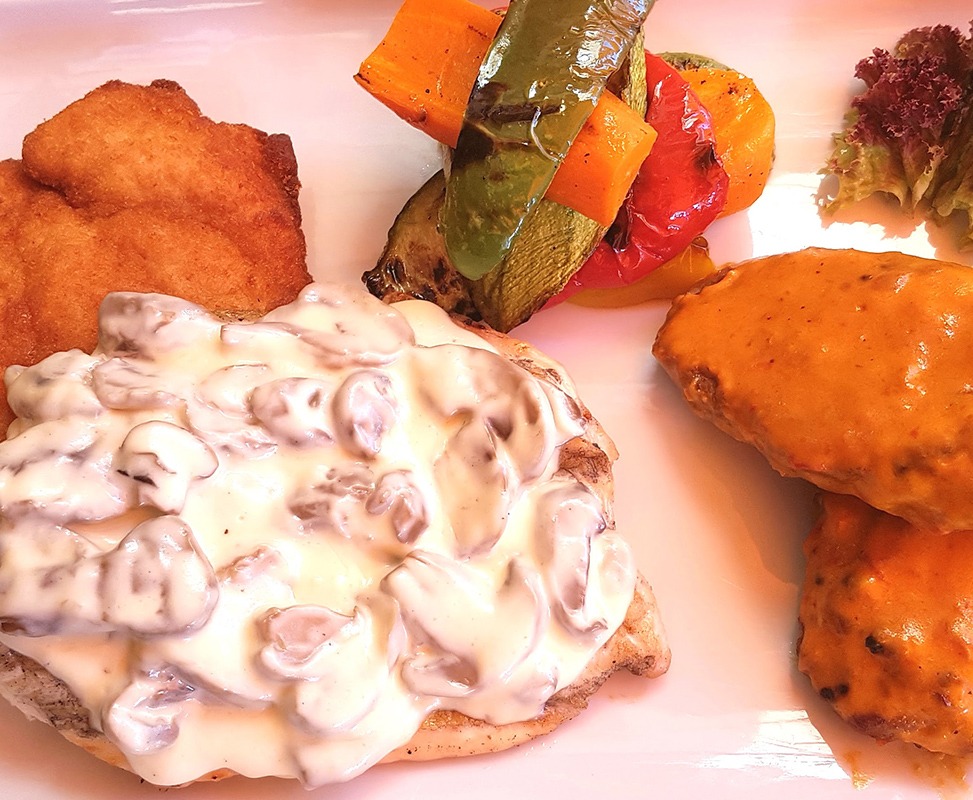 Στο κοτόπουλο φιλέτο & το μπιφτέκι οι σάλτσες και οι γαρνιτούρες είναι όπως και στα Σνίτσελ